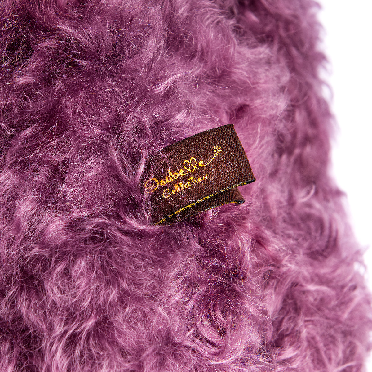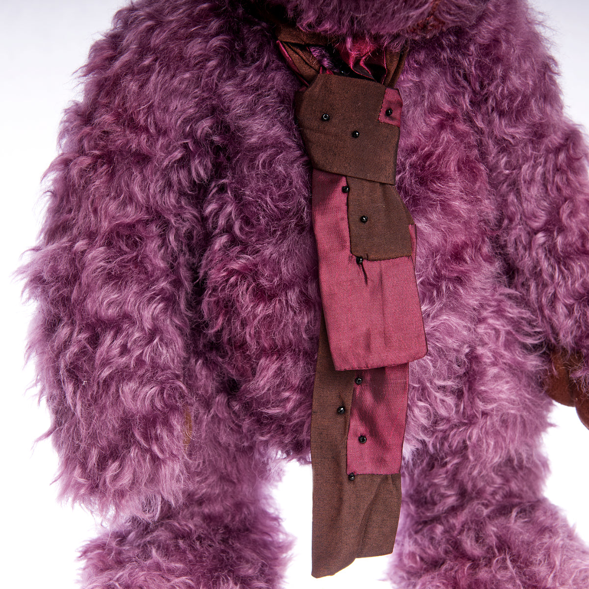 Handmade and fully covered in stunning wavy mauve mohair, Buster has a luxurious and eye-catching coat that sets him apart. He is fully jointed with weighted limbs, giving him a satisfying feel and allowing for natural, expressive posing. His contrasting cocoa brown ultrasuede paw pads add depth and refinement to his overall look.